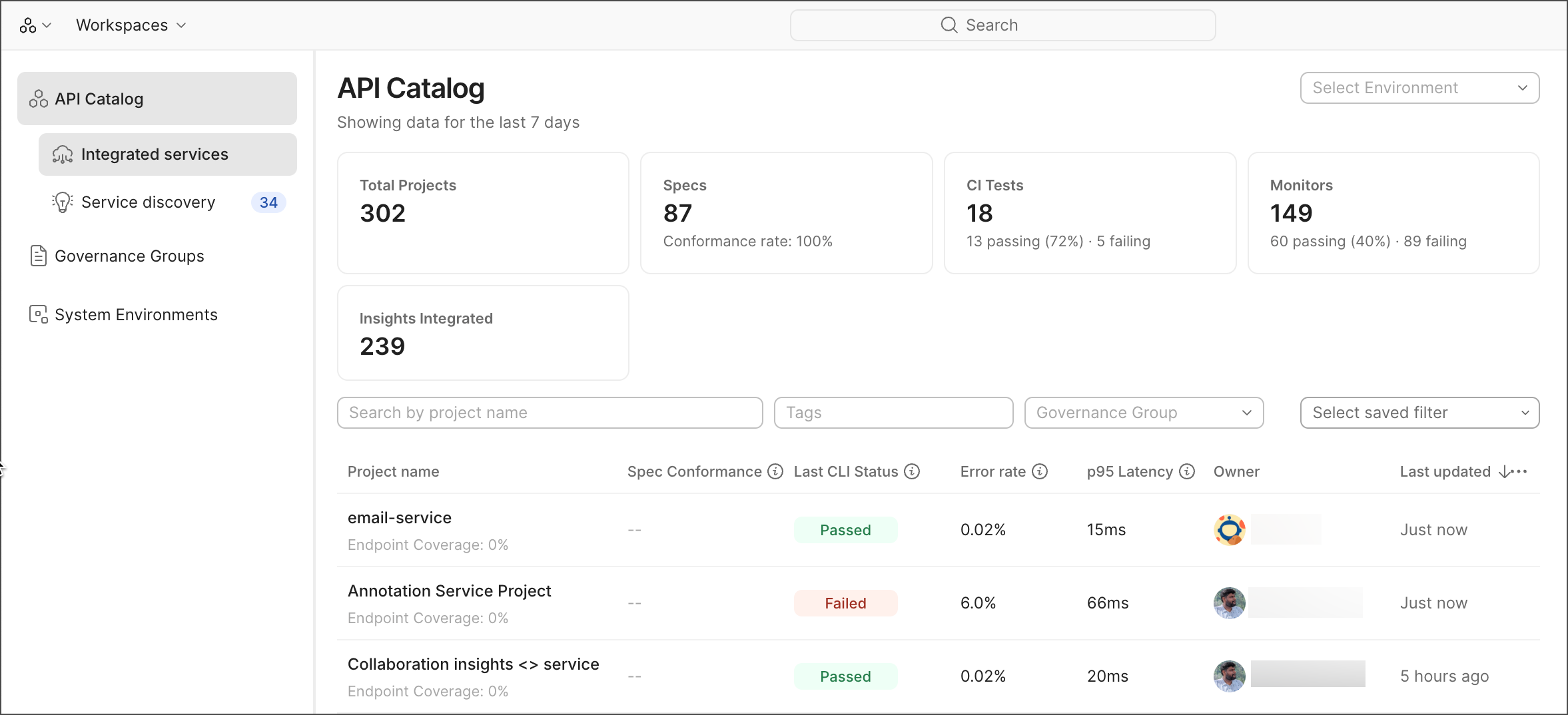The API Catalog shows all of your discovered services. You can filter and sort your API list in different ways. Use tags to mark which APIs you want to manage. The catalog shows who owns each API. You can also see how APIs are connected to each other and check health metrics. The API Catalog also shows you which APIs aren’t properly managed with Postman Insights (if you have access).