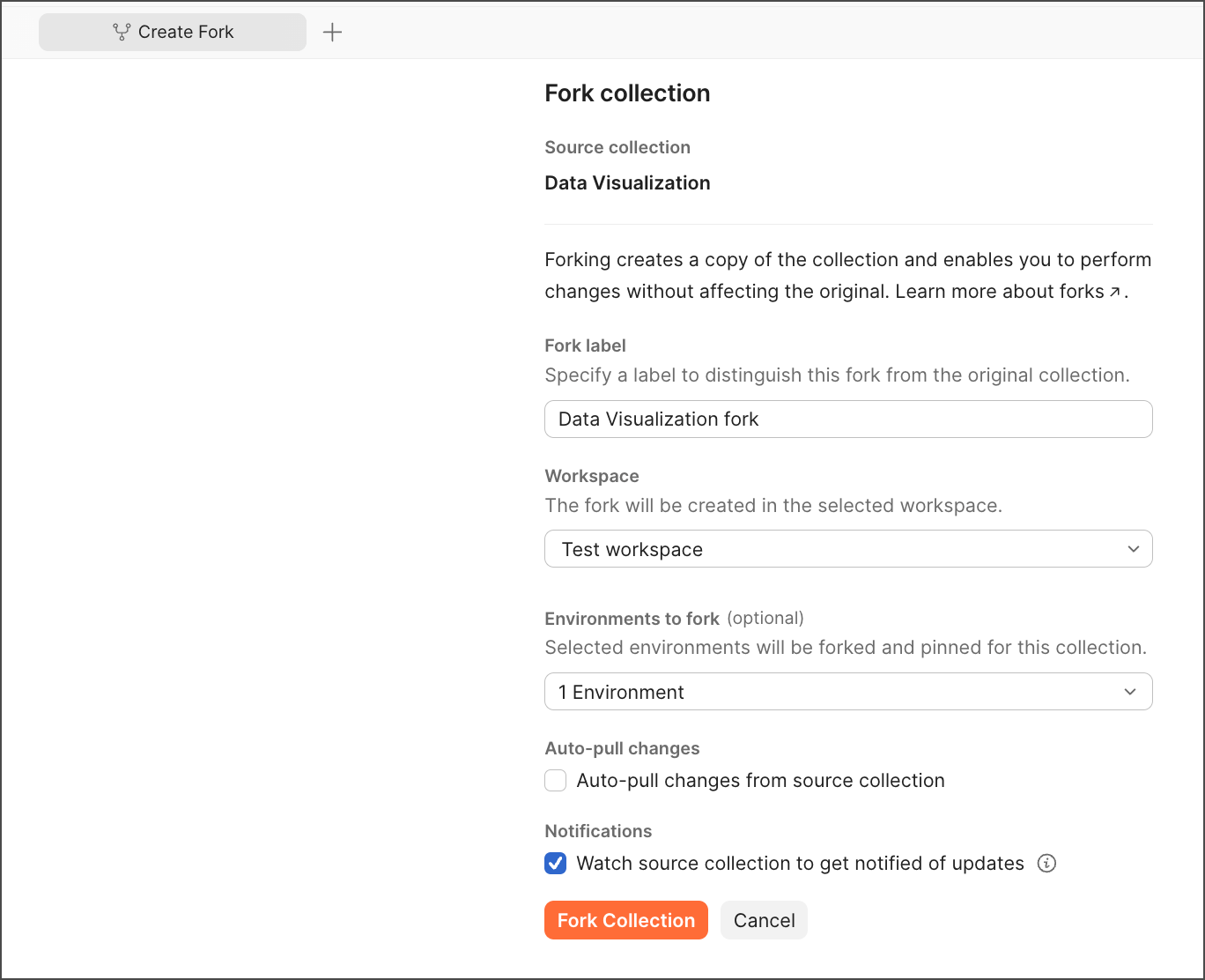 4. (Optional) If you are forking a collection, you can select one or more environments to include with the fork.