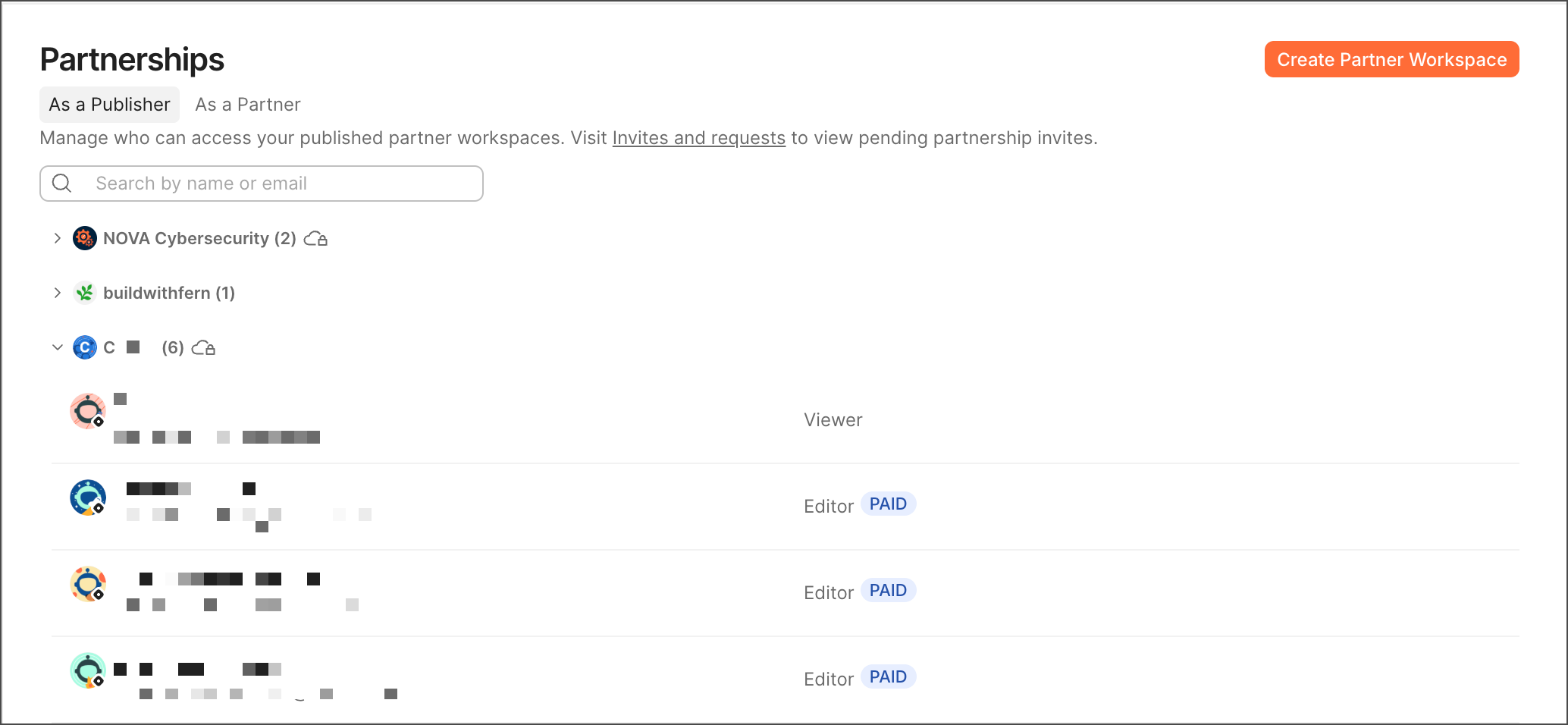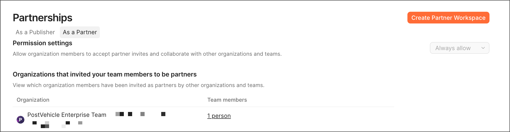 The As a partner tab contains the list of the teams who have invited your team members as Partners to collaborate in their Partner Workspaces.