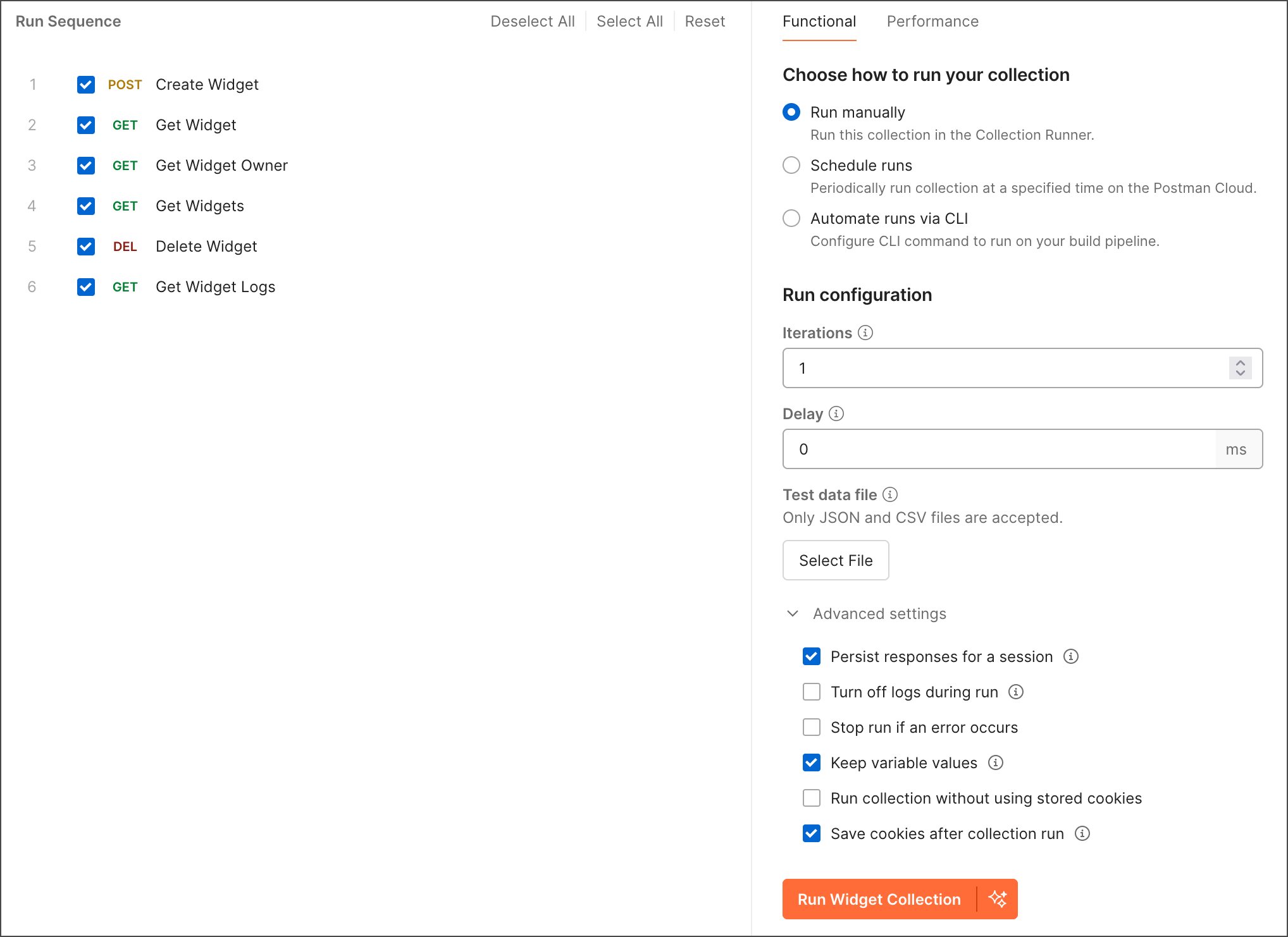 - Iterations - The number of times to run the collection. You can also run collections multiple times with different data sets to build workflows.