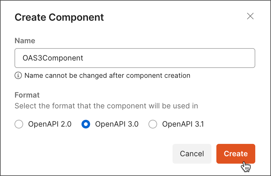 Enter a name for the component file and select the OpenAPI specification format it’ll be used in. You can’t change the name or OpenAPI specification version of a component file later.