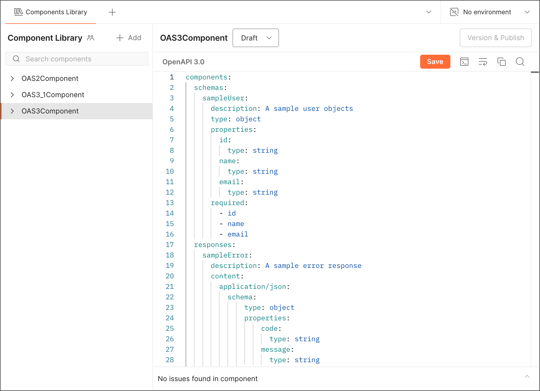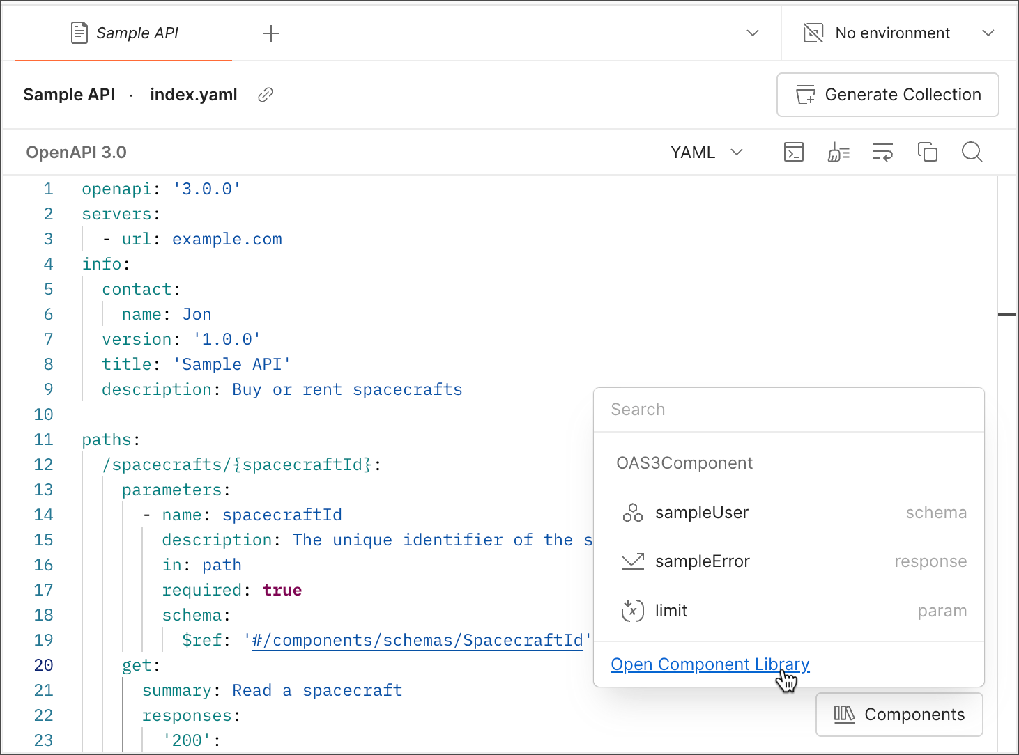 Postman adds a new component file to your team’s component library in the OpenAPI specification format you chose. Add your own components to the file so your team can reuse them in their specifications.
