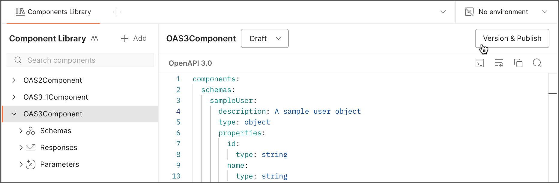 Create a component file in your team’s component library. Name the file and specify the OpenAPI specification format the components will be used in. In the file, define components that your teammates can reuse in their specifications.