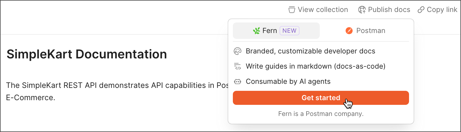 When you publish a Postman Collection with Fern, Fern automatically generates your API reference documentation from your collection. Your site is deployed live and backed by a GitHub repository that your team owns.