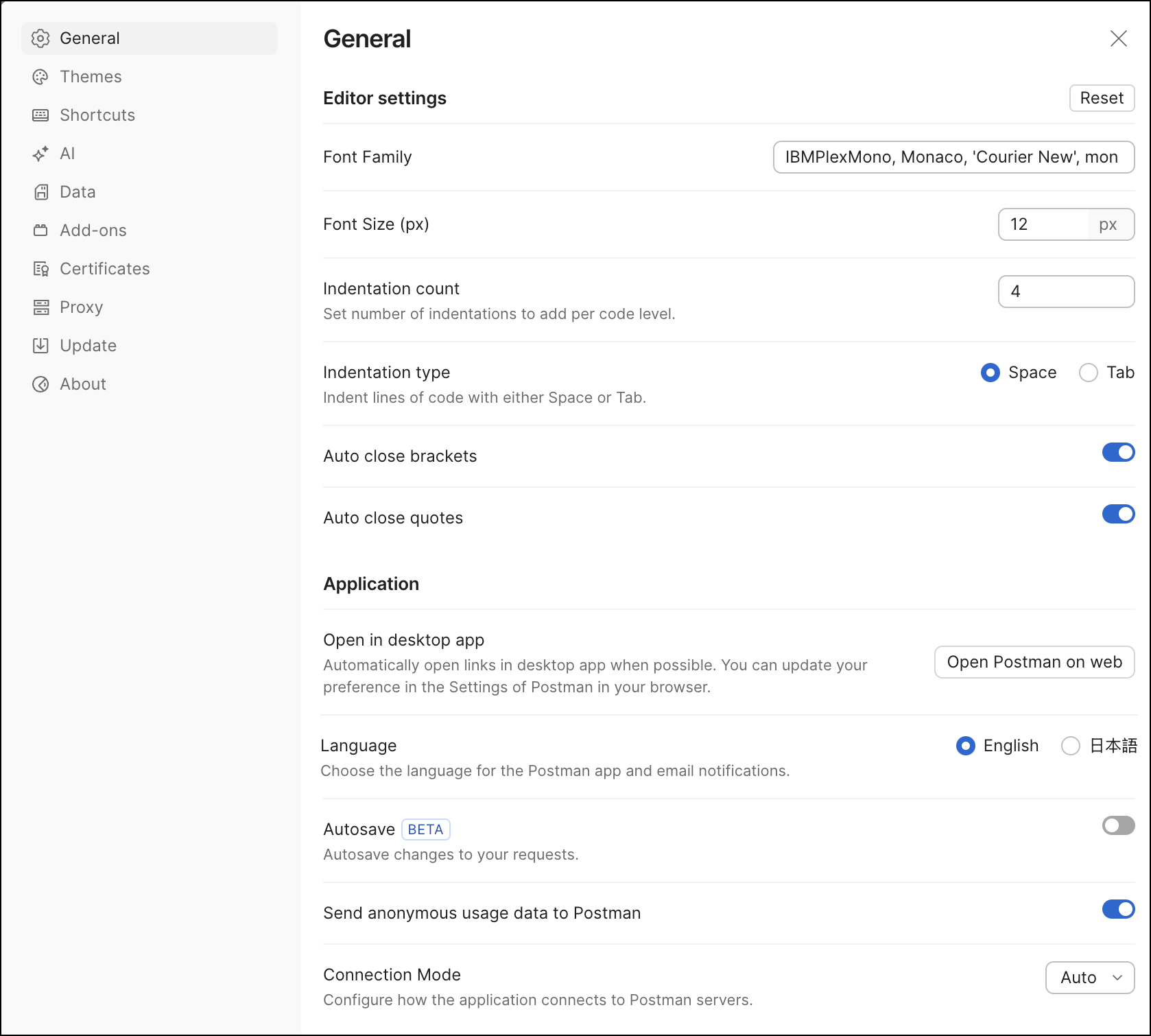 Editor settings affect code-related text such as request and response bodies, pre-request scripts, and tests. To revert to default text settings, click Reset.