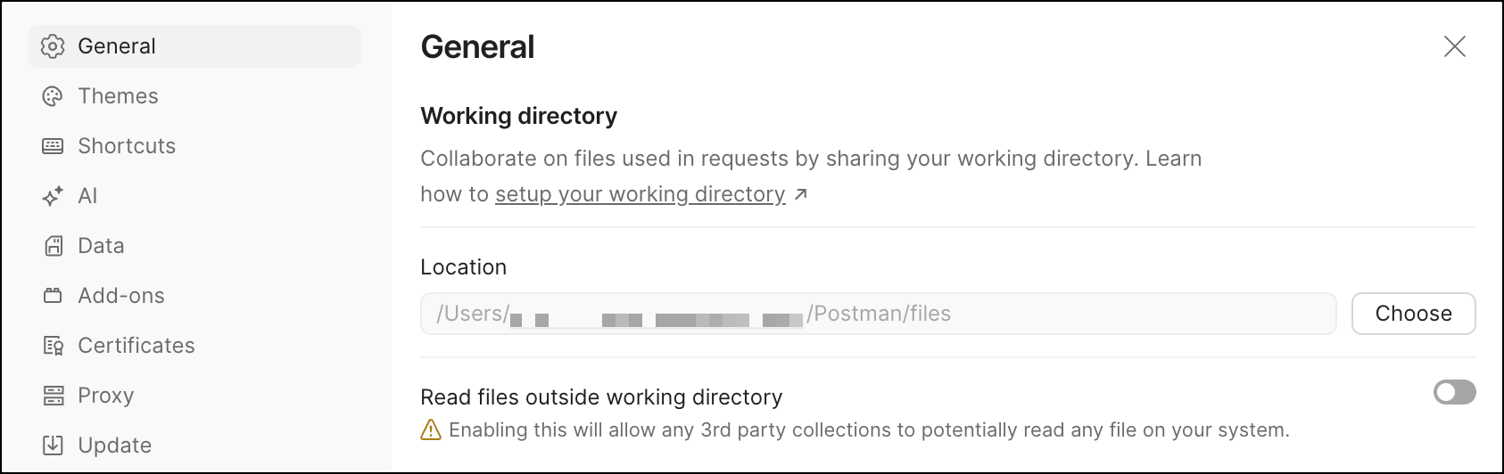 Use caution with files located outside your working directory. To use files located outside your working directory when sending requests, turn on Read files outside working directory. This option gives third-party collections the ability to read any file on your system. Use caution, and make sure you trust all third-party collections you are using before enabling this option.
