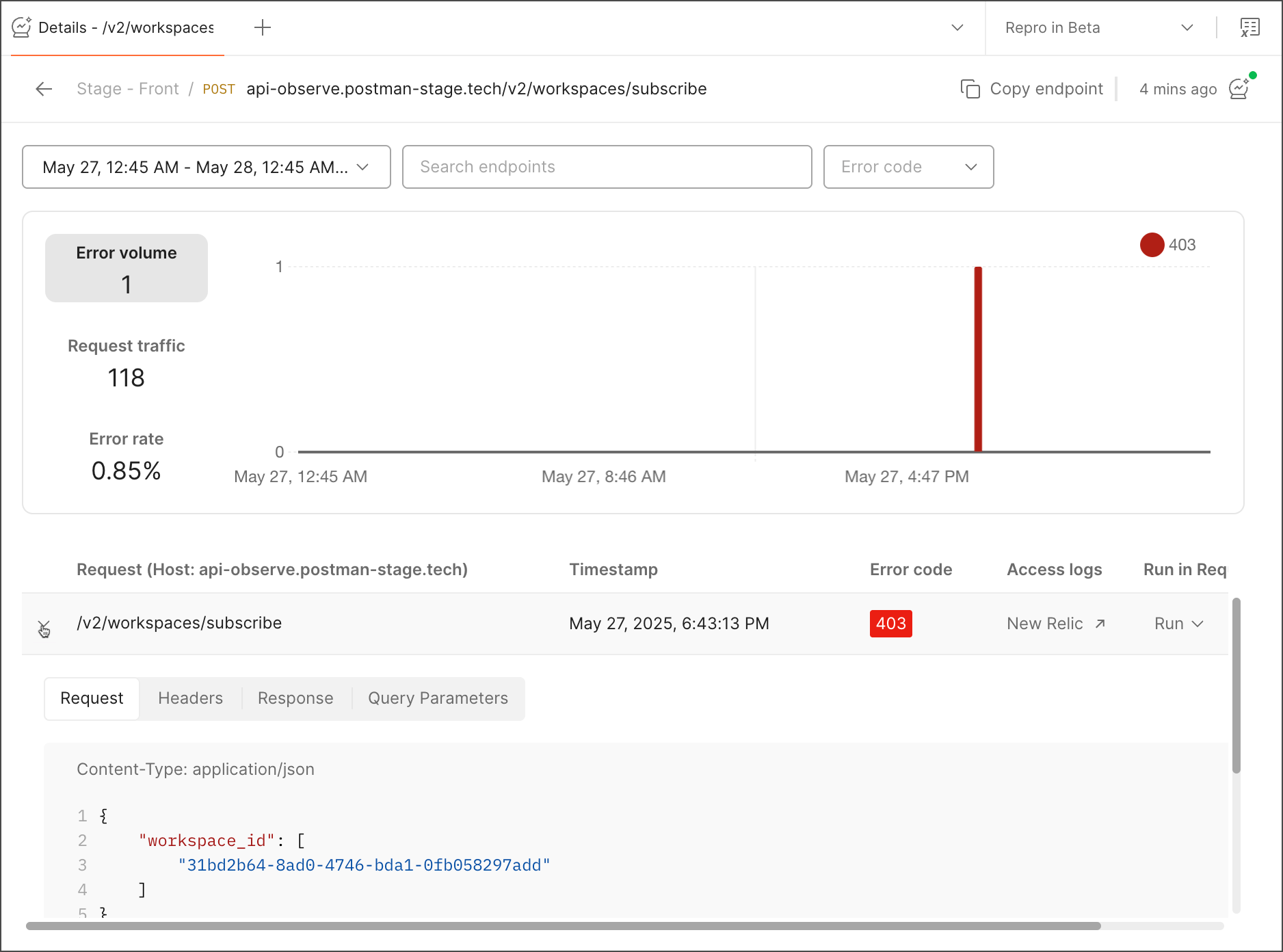 Select a failed request you want to inspect and reproduce. Then, expand it to observe the endpoint details such as request, headers, response, and query parameters, if any.