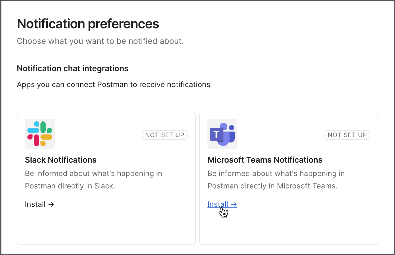 If Microsoft Teams isn’t already connected to your Postman account, click Install in the Microsoft Teams Notifications integration panel.