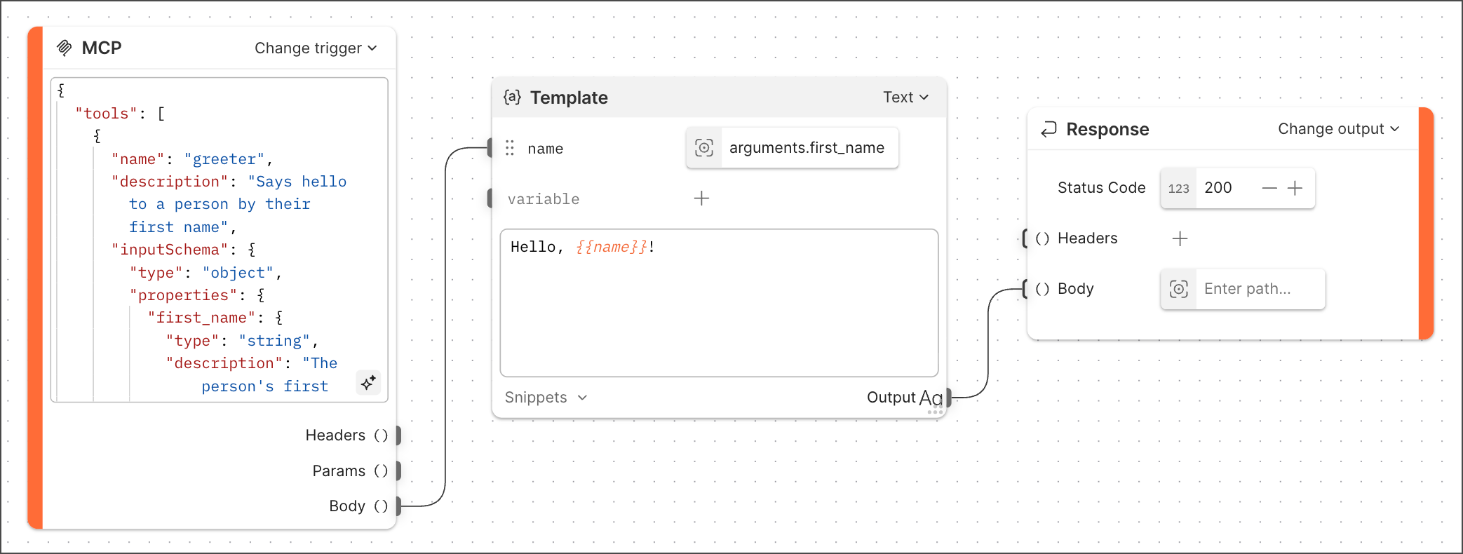 In the MCP block’s text box, enter one or more tools using the MCP tool definition structure. For example, adding the following to the MCP block defines a tool that greets a user by name: