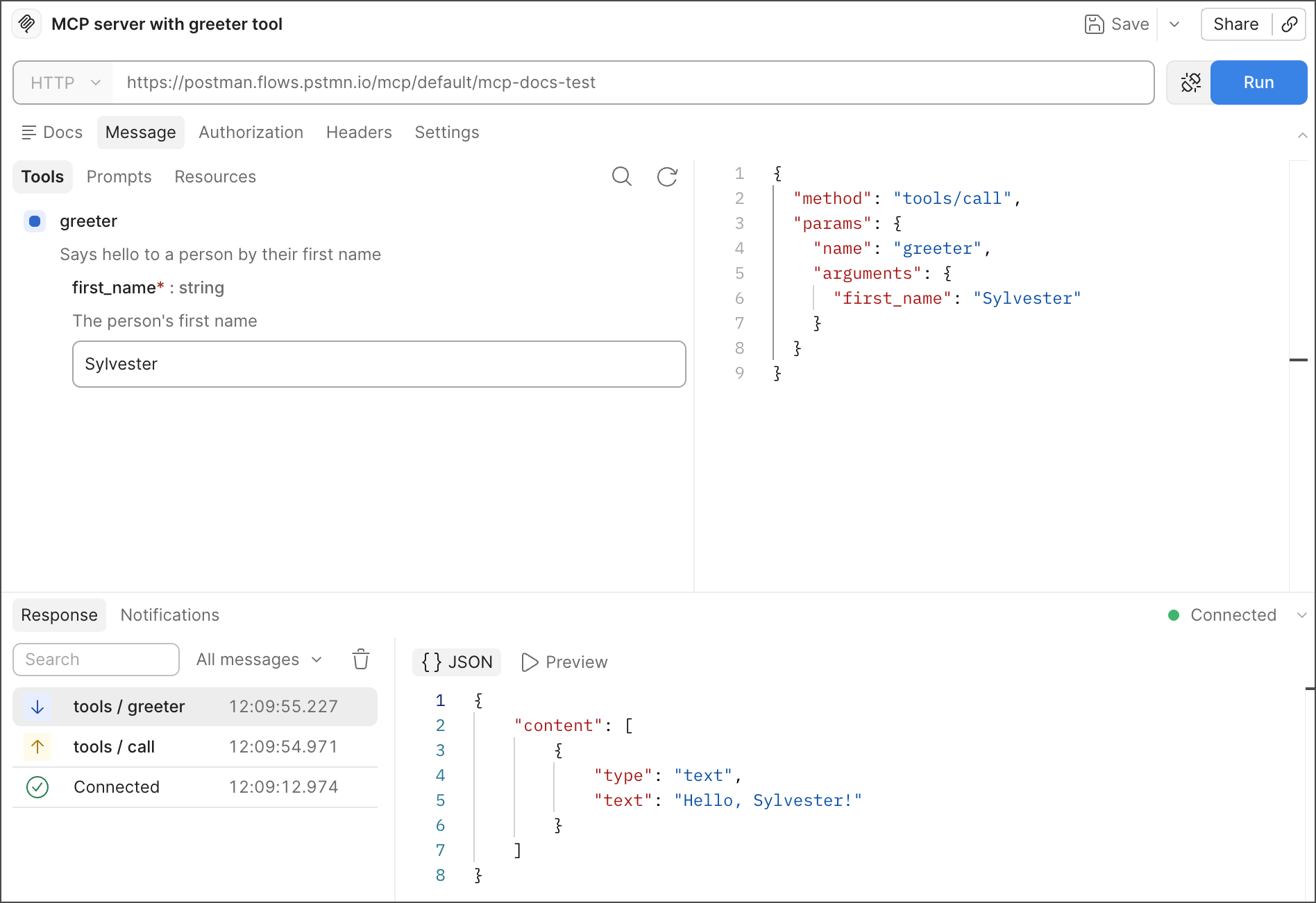 Click Connect. The MCP server’s tools appear in the Message section. Click a tool to view and enter any required arguments.
