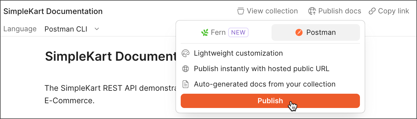 Publish docs, then select Postman.