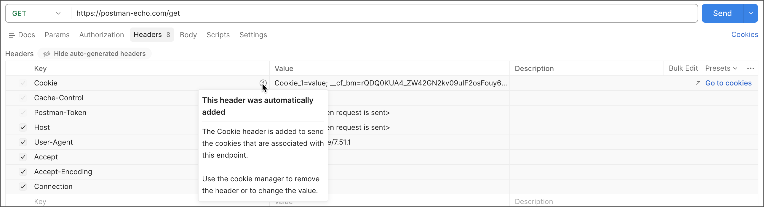 When you make a request to a domain you have added a cookie to, the cookie automatically appears in your request Headers tab. If the cookie isn’t visible, click hidden to show autogenerated headers.