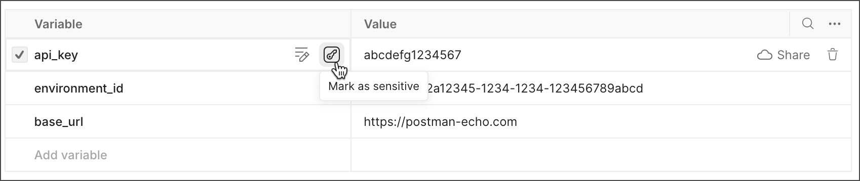 Mark as sensitive next to the variable name to set the variable as sensitive data, masking the value in Postman. Learn more about setting a variable as sensitive data.