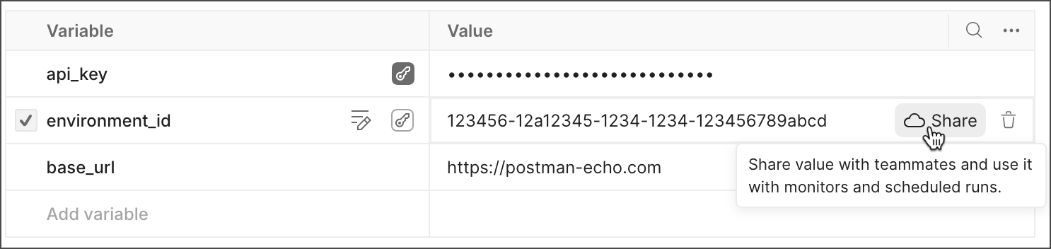 If you have Editor access to the element, you can share a variable’s value, syncing it’s value to the Postman cloud. Share a variable’s value to provide your teammates with a default value they can use to begin making requests to your API. Your teammates can continue to update their local value without sharing it. They can also reset their local value back to the shared value at any time.