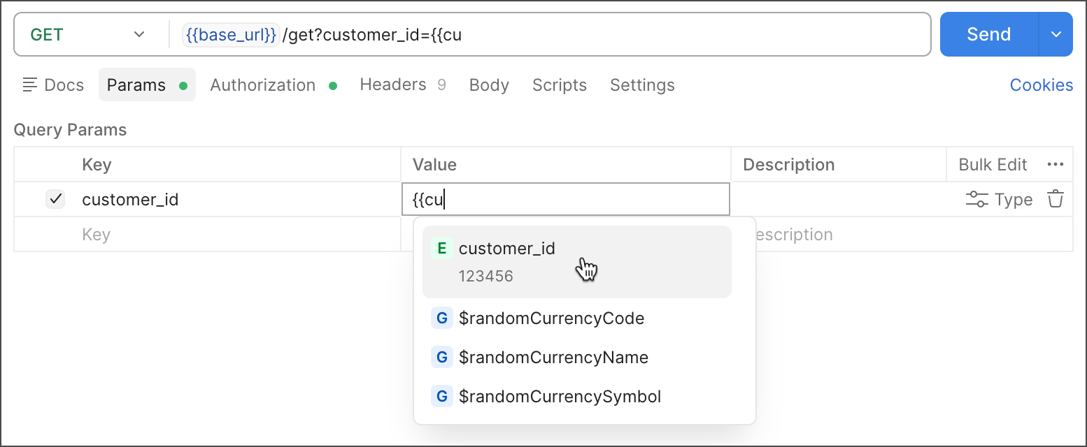 {{$guid}}- A v4-style GUID.{{$timestamp}}- The current Unix timestamp, in seconds.{{$randomInt}}- A random integer between 0 and 1000.