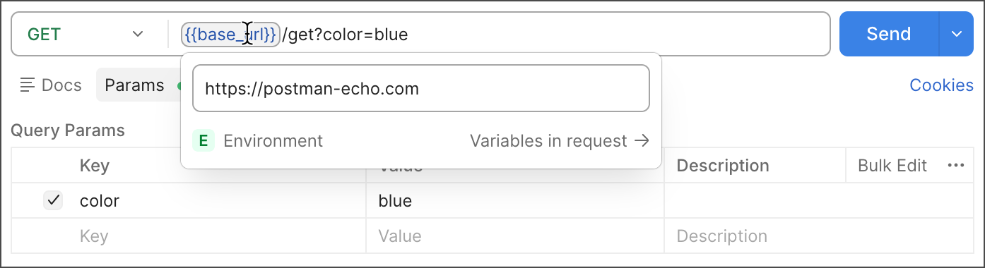 The same principle applies to any part of your request where data is repeated. Whatever value is stored in the variable will be included wherever you’ve referenced the variable when your requests run. If the variable value is https://postman-echo.com and the request uses the {{base_url}}/get URL, then Postman sends the request to https://postman-echo.com/get.