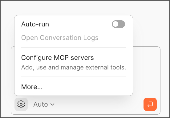 The Settings menu also gives you options to run tools automatically and configure MCP servers. Setting Auto-run to false will require your approval before any actions are taken by Agent Mode.