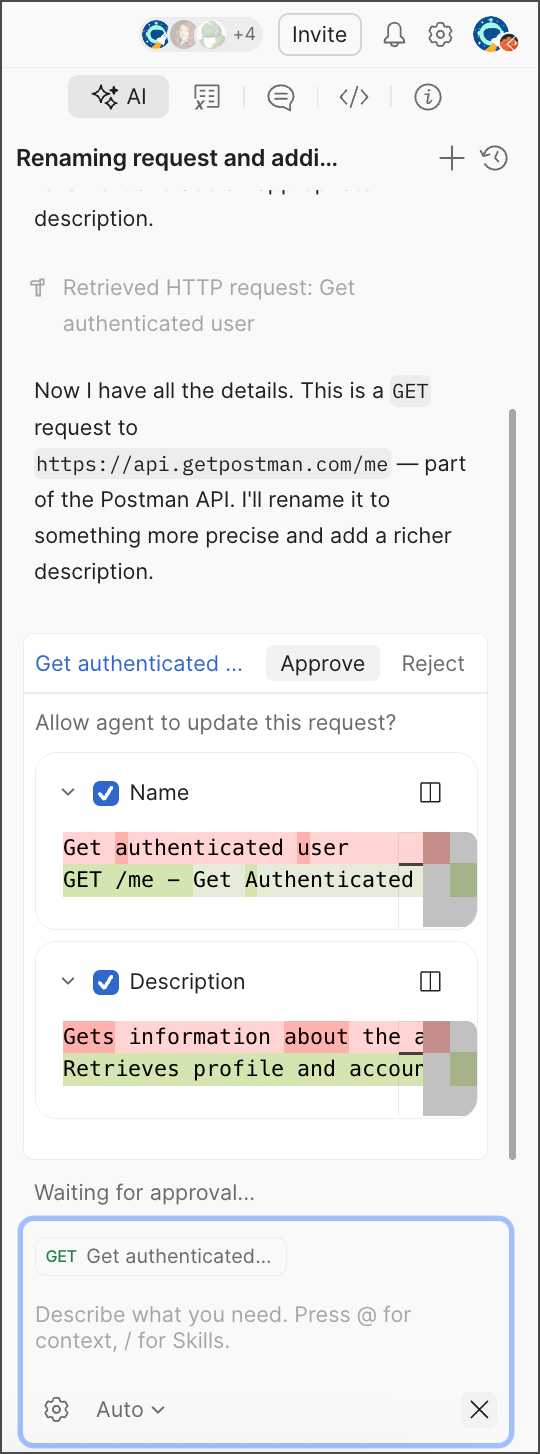 Not sure what to do? Try asking “What tasks can I do in Agent Mode?” for a full list of its capabilities and common tasks you can use to work more efficiently with your API development and testing workflows.