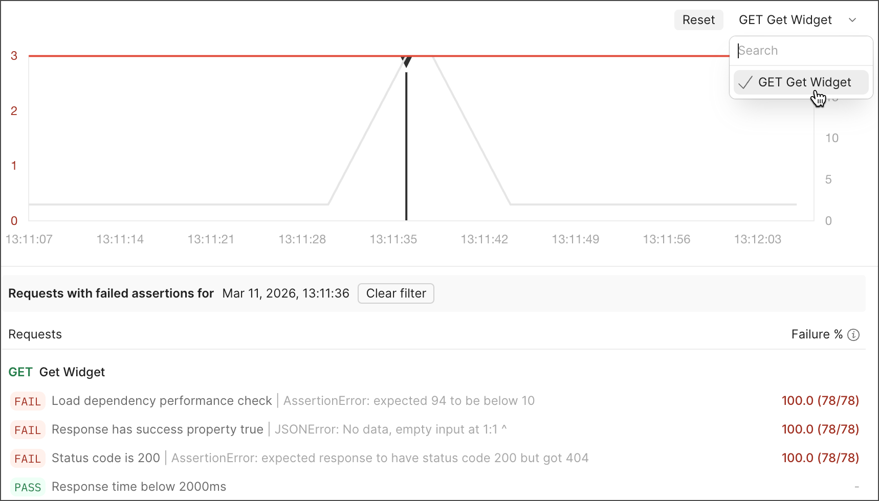 - Click a point on the graph to view the requests and test assertions that failed during the timestamp. Click Clear filter to return to the default view.
