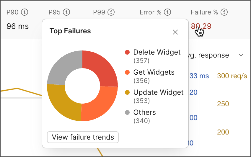 On the Summary tab, you can click Failure % to view the top requests with failed test assertions that ran during the performance test. You can click View failure trends to view request failure trends during the performance test.