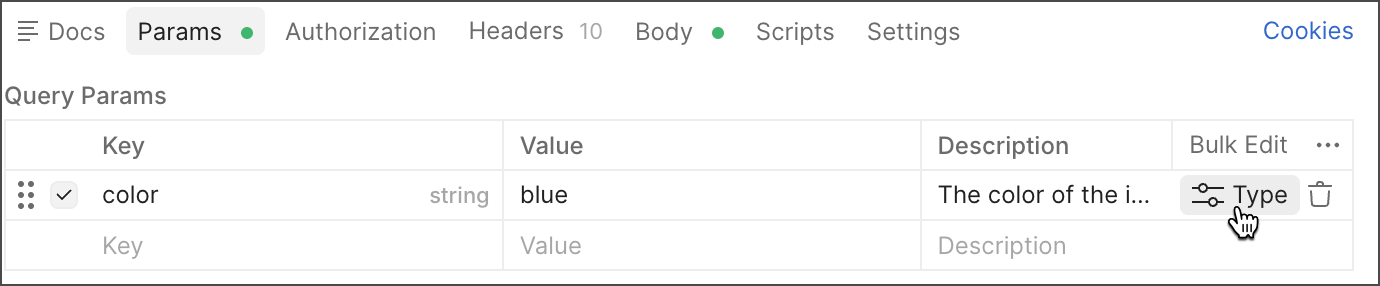 You can add types to parameters and headers to your HTTP collections. Types can include data type, format, default value, and possible values. You can also specify if a component is required. Details you add will appear in the collection’s documentation.