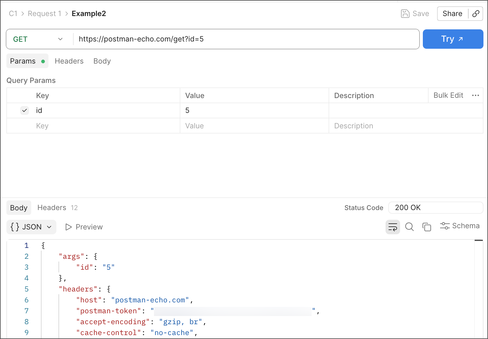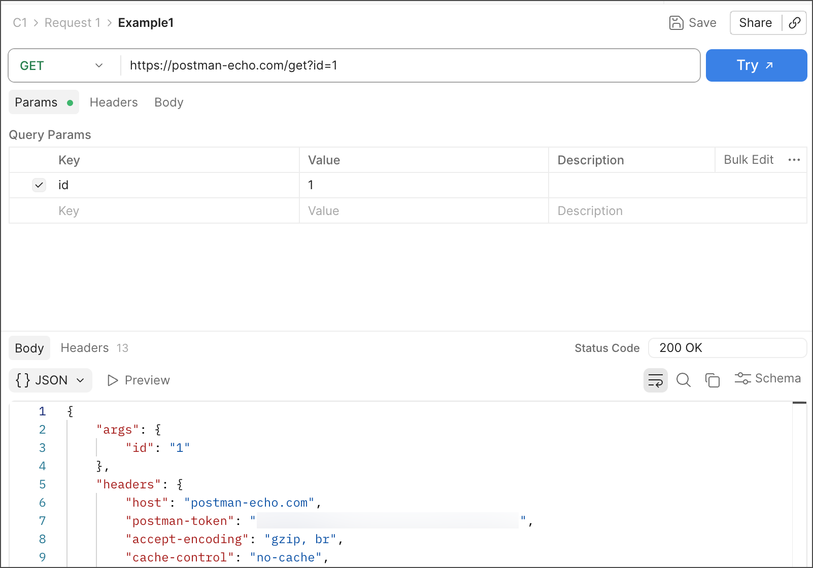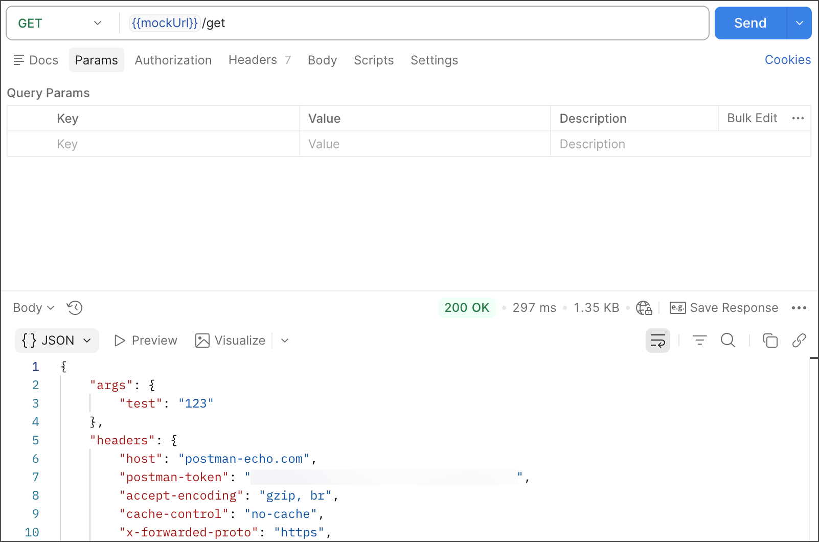 https://postman-echo.com/get?test=123as the request URL. - Click Send, then click