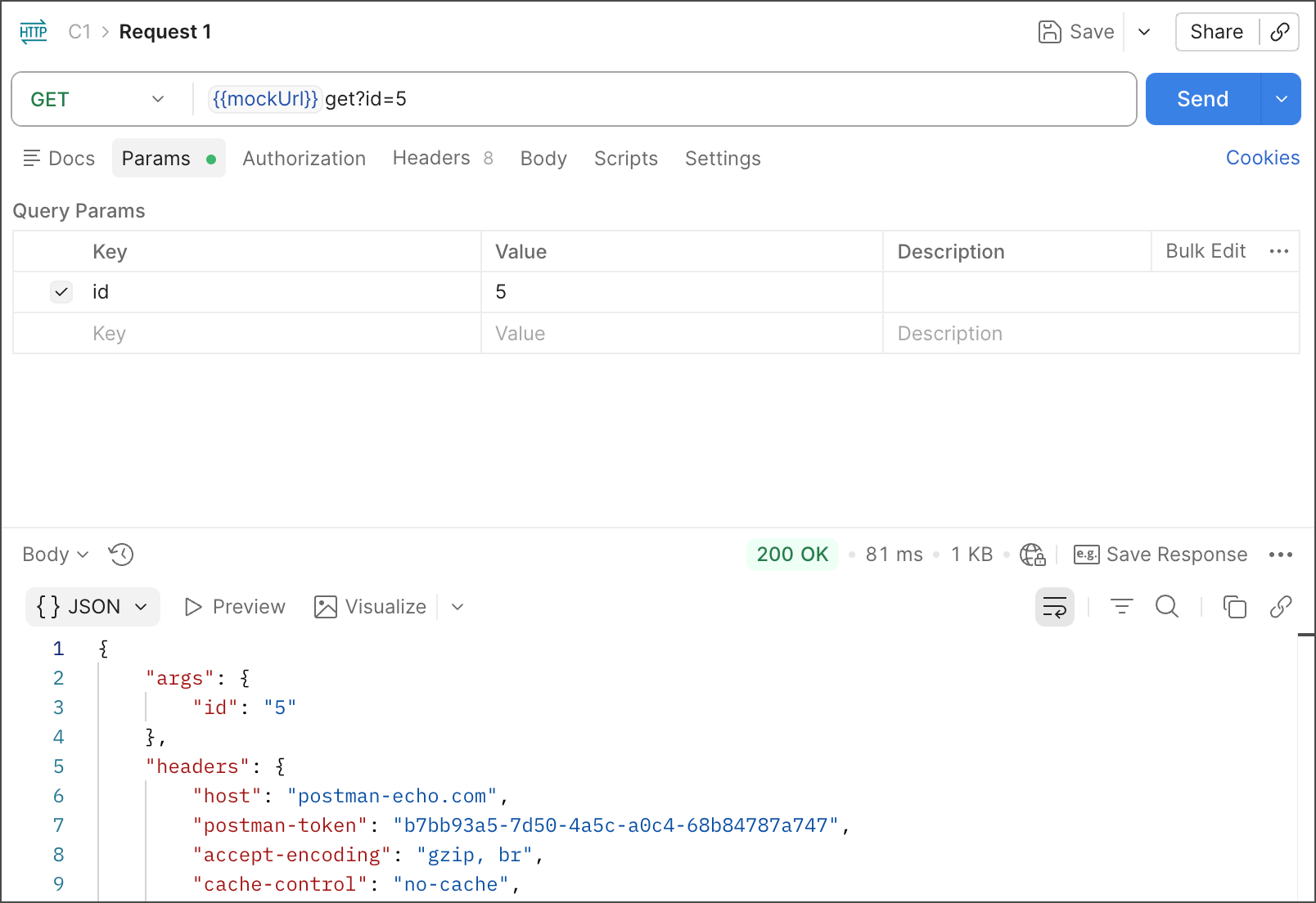 /get), but they each have anidquery parameter with different values. When you send a request to the mock server URL and pass these different query parameters, Postman returns the exact response that matches both the path and the query parameters.