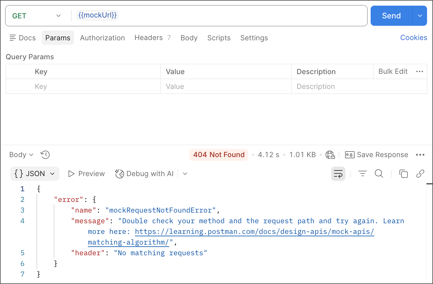 The request returns an error because the mock server’s URL doesn’t have a defined path. The path appended to the end of the mock server URL must match the path in the example’s request URL (