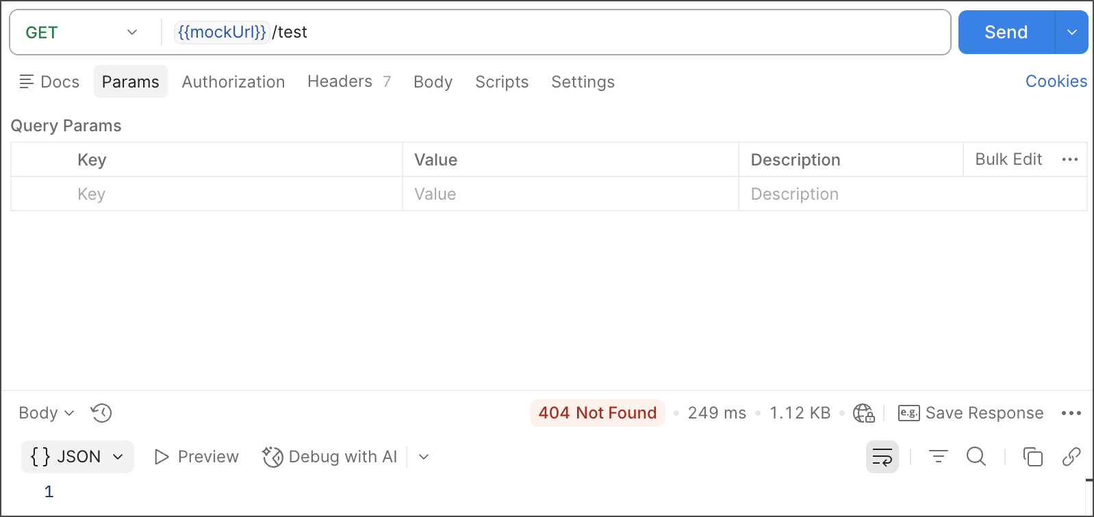 /testand click Send. The mock server returns the expected HTTP 404 Not Found status code.
