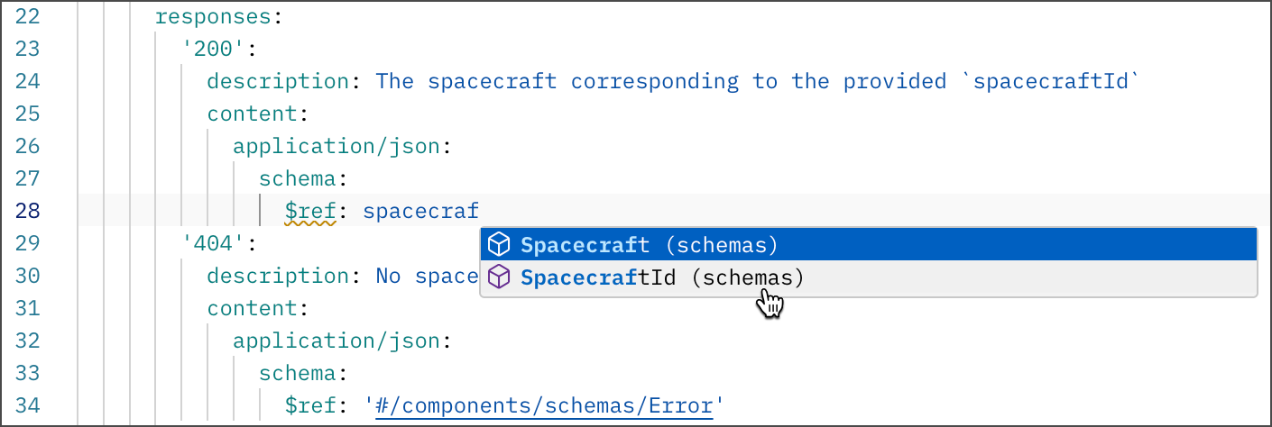 Postman offers autocomplete suggestions as you edit your specification. Postman suggests properties and valid values based on the specification type and existing content. Postman also identifies syntax errors and API governance issues, and shows details so you can fix them.