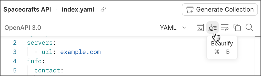In the upper right are options to convert your specification’s format (JSON or YAML), beautify the content, wrap text, copy the specification, and search. When you finish editing your specification, click Save.