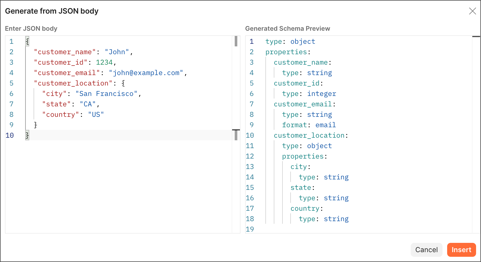 Click Insert to add the generated schema to your specification.