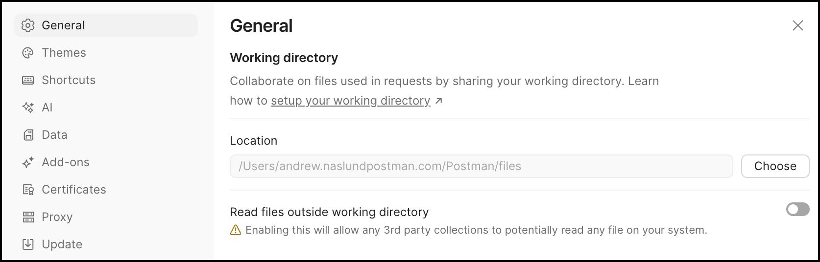 Use caution with files located outside your working directory. To use files located outside your working directory when sending requests, turn on Read files outside working directory. This option gives third-party collections the ability to read any file on your system. Use caution, and make sure you trust all third-party collections you are using before enabling this option.