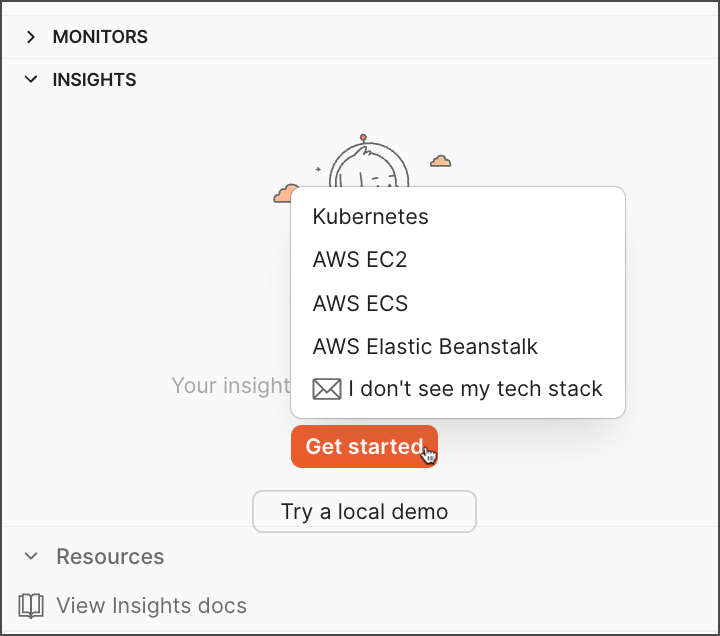 If you don’t see your stack, you can email the team using the corresponding option in the Get started dropdown list or Resources on the bottom left.