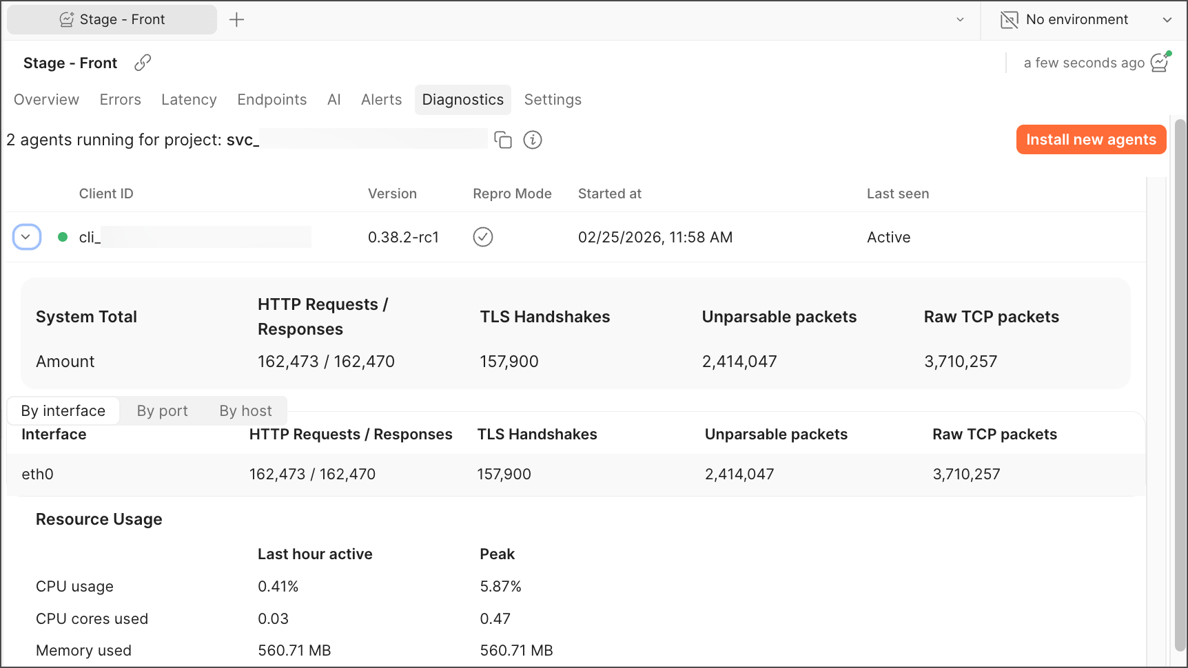The Diagnostics tab displays the metadata of the agents that are running and sending traffic for a service. Visit this page if you’re not sure if the Insights Agent is connected, or if you want to check that the agent is seeing all of your traffic. You can also install new agents from this tab.