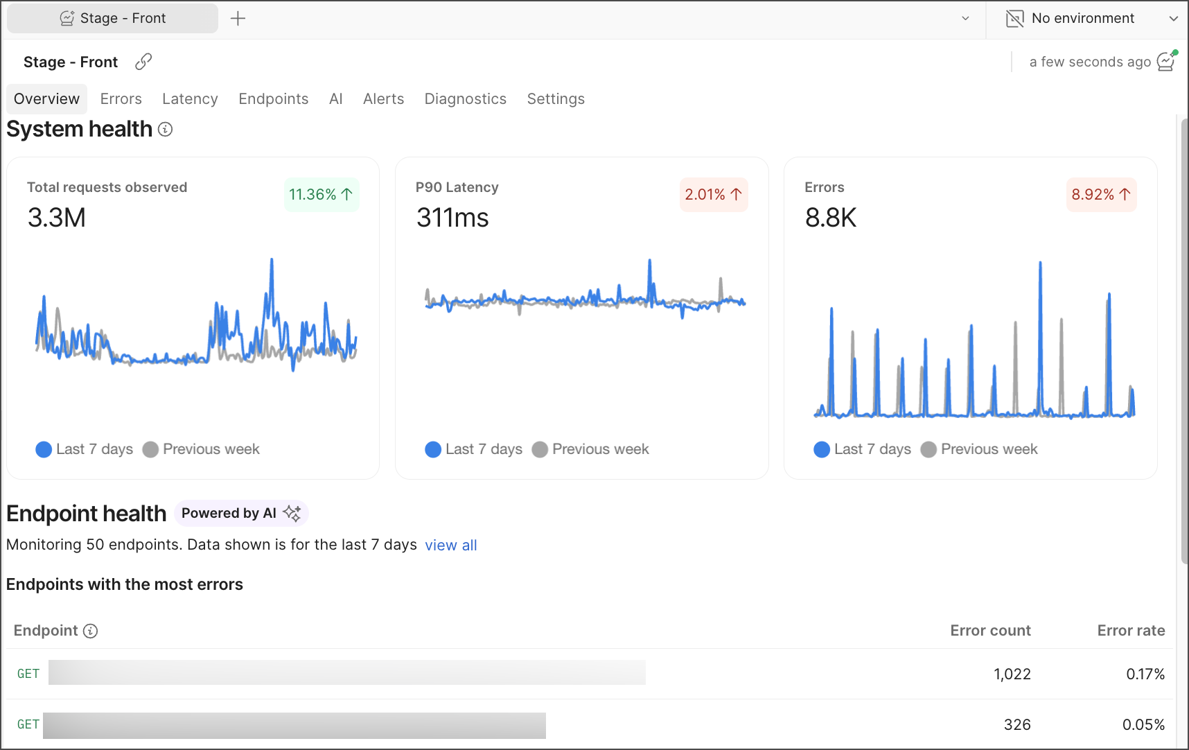 To give you a quick summary of system health, the Overview tab provides an overview of your service over the last 7 days. This displays information such as Total requests observed, P90 Latency, Errors, and Endpoint health.
