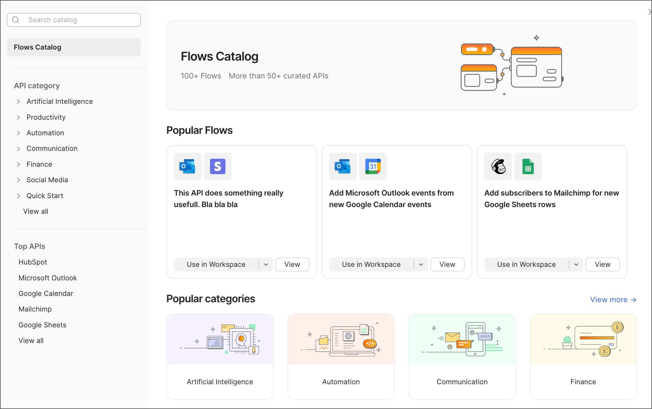 Flows Catalog is a collection of over 100 pre-built flow templates designed to address common use cases. Exploring the Flows Catalog is a great way to learn what Postman Flows can do.