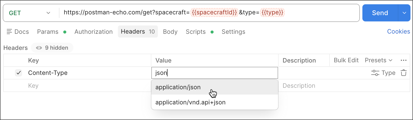 You can configure headers in the Headers tab of your request. Enter any key-value pairs you need and Postman will send them along with your request. As you enter text, Postman prompts you with common options you can use to autocomplete your setup, such as Content-Type.
