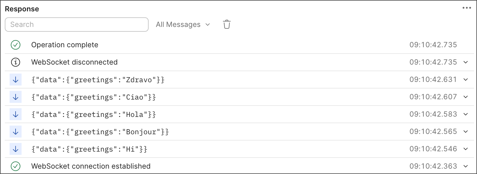 Select a message to expand it and see its contents. Use the search box to search for specific messages. You can also filter for all messages, responses only, or other types of messages. Click Clear messages to remove all the messages from the response section. You can select Restore to show them again. Click