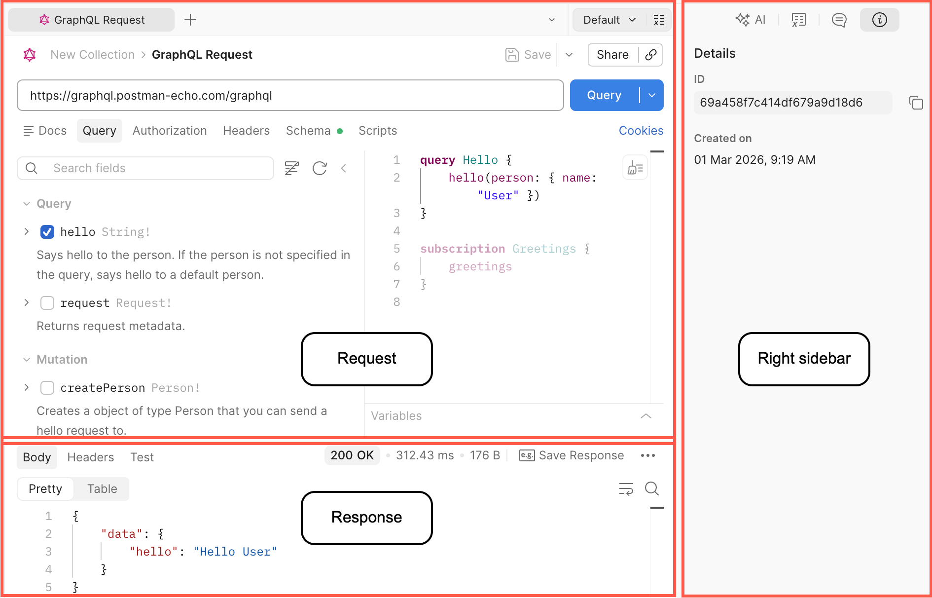 When you run a query, the response from the server appears here. The GraphQL client’s response section is similar to Postman’s regular response viewer.