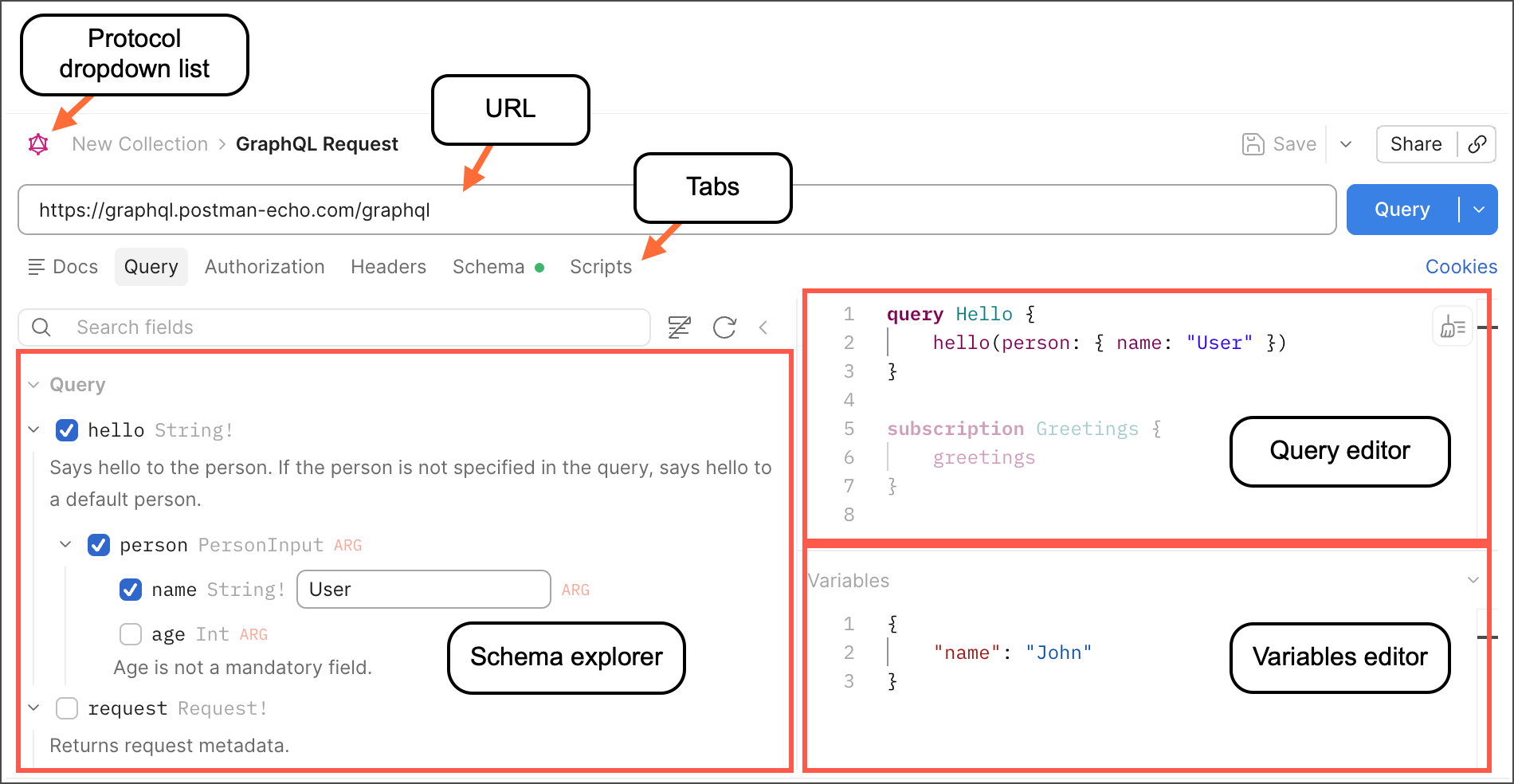 In the GraphQL client’s request section, you can enter an endpoint in the URL box as you would in the regular Postman request interface. But the GraphQL client adds GraphQL-specific features, including an interactive schema explorer.