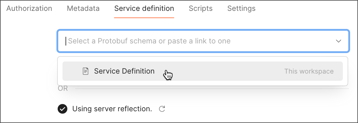 If server reflection isn’t enabled by the server, you can use a protobuf specification for the request’s service definition. You can select an existing protobuf definition in your workspace, or import a .proto file as a protobuf API into Postman.
